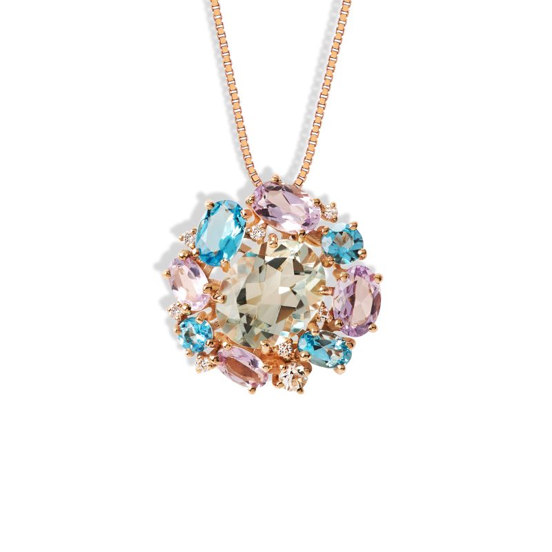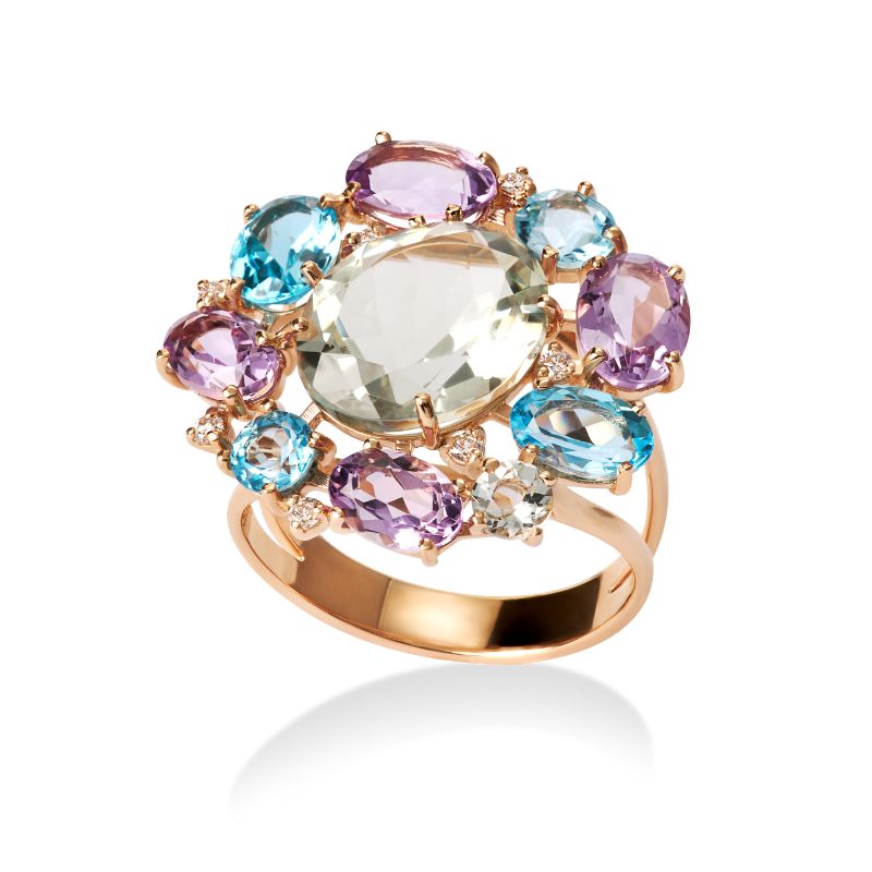 Anel Sintonia em Ouro Rosé com Ametistas, Topázios, Prasiolita e Diamante