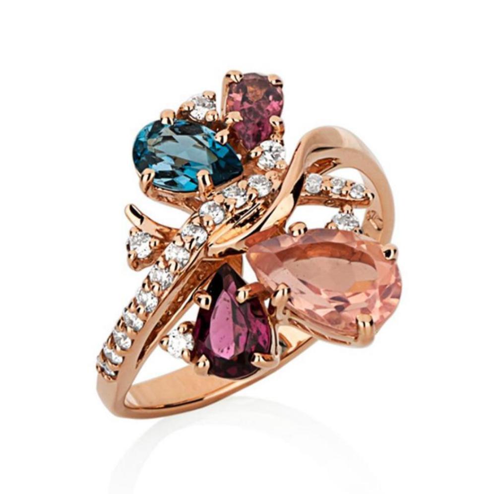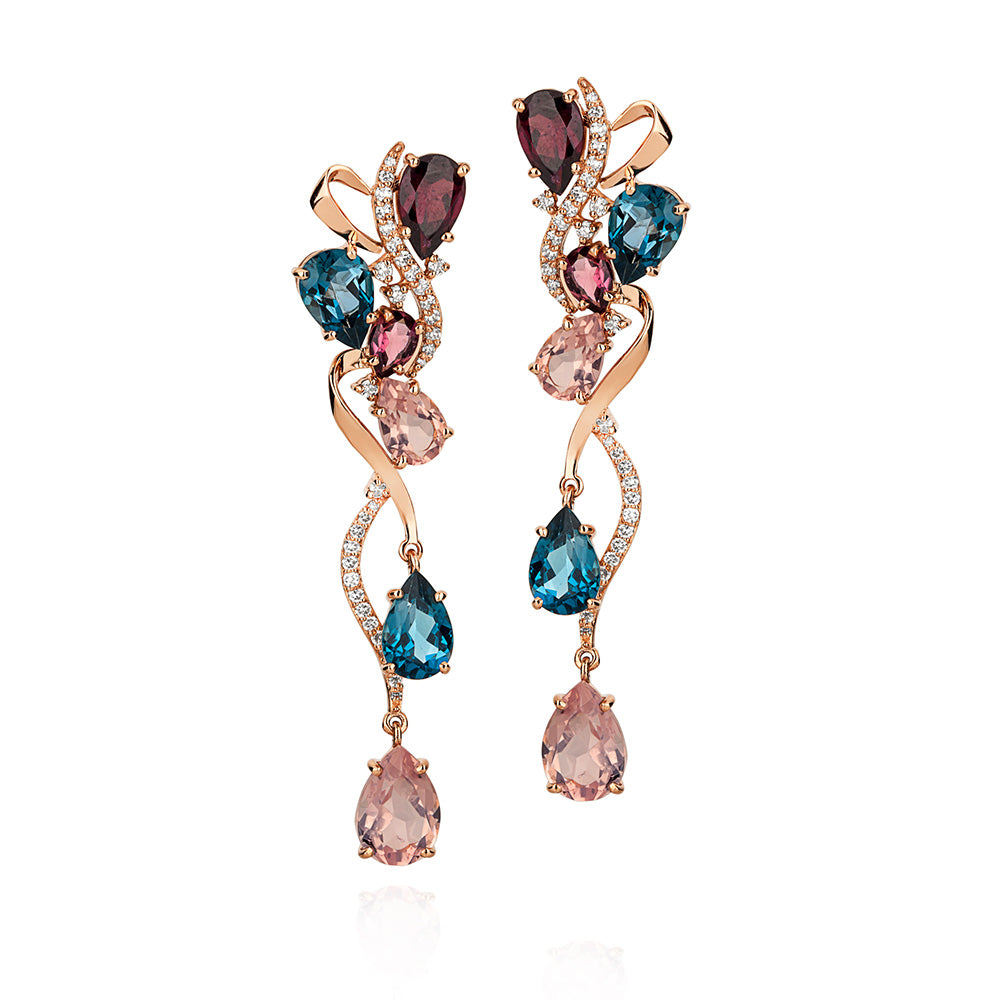 Brinco em Ouro Rosé com Topázio London, Turmalina Rosa, Rodolita, Quartzo Rosa e Diamantes - Coleção Tango