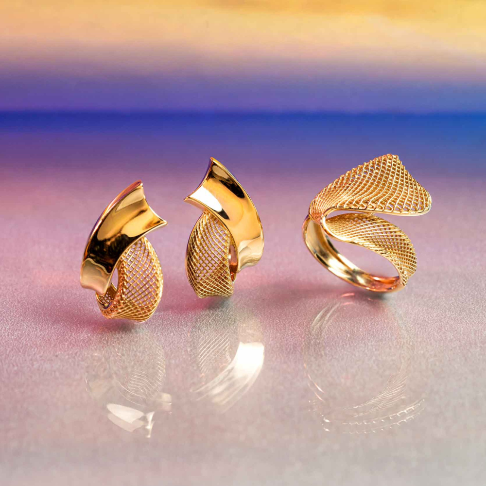 O anel Blend apresenta uma estrutura sólida em ouro amarelo 18K, garantindo durabilidade e qualidade excepcionais. O detalhe em tela de ouro, criado com recursos da joalheria moderna, adiciona uma camada de textura e profundidade à peça, proporcionando um toque de modernidade e sofisticação futurista.