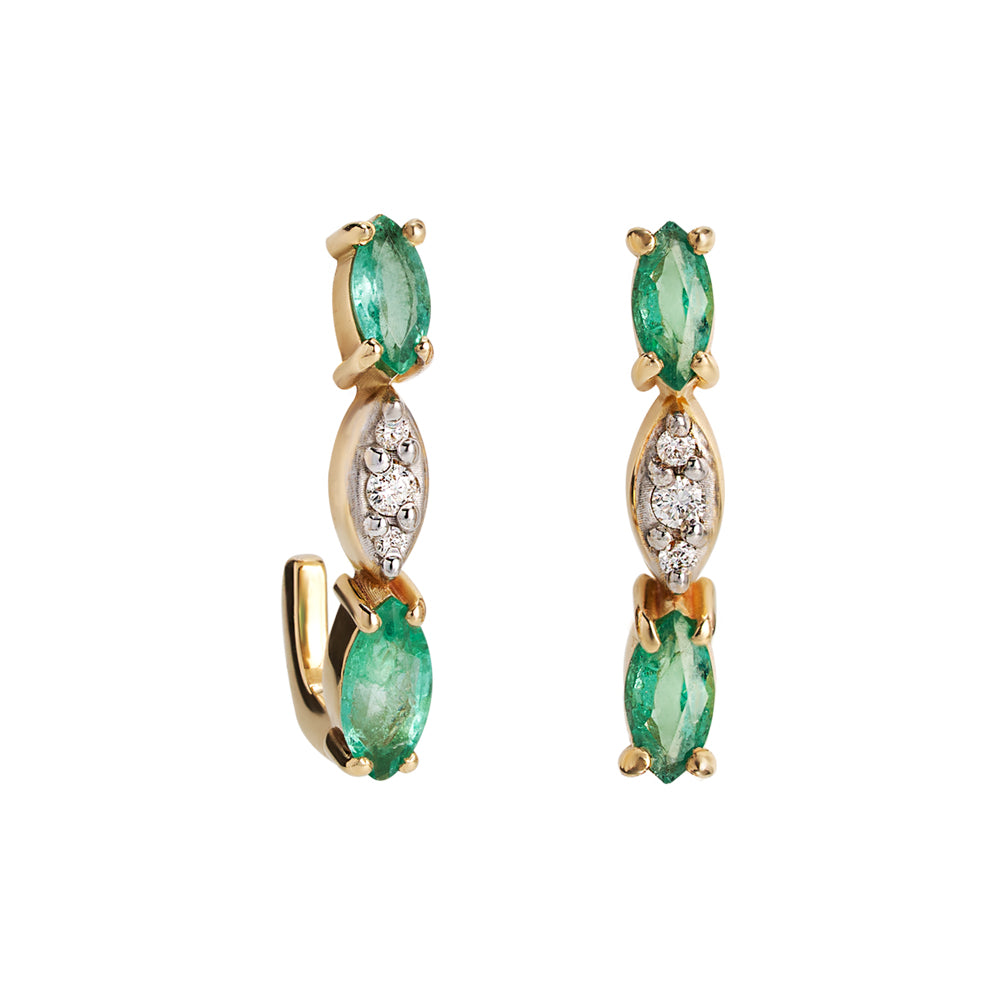 O brinco Gem é uma joia sofisticada com personalidade. Em ouro amarelo 18K, esmeraldas navete em diferentes tamanhos se destacam em meio ao brilho suave dos diamantes. Uma escolha elegante para o dia ou a noite.