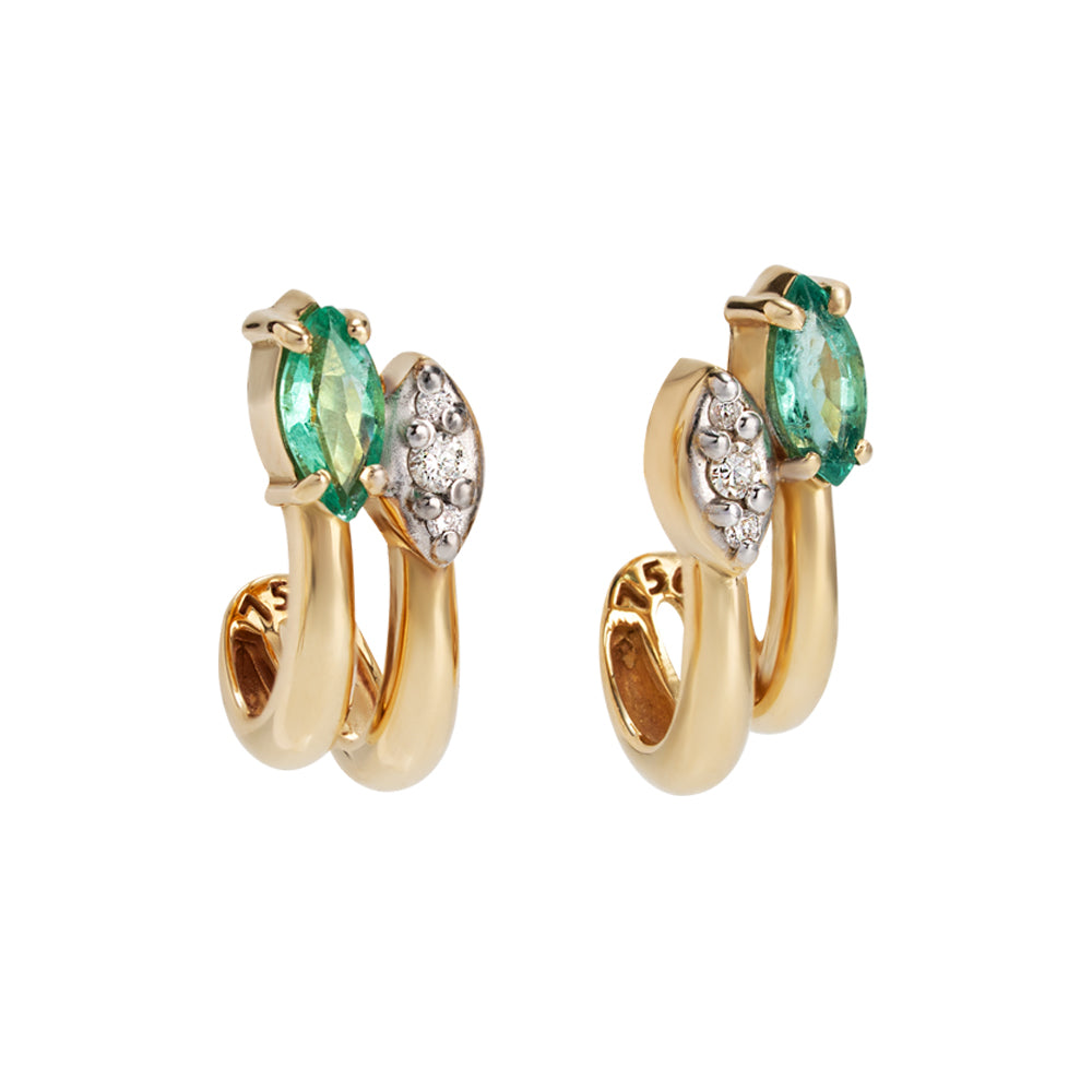 Este brinco da coleção Gem em ouro amarelo 18K combina esmeraldas navete e diamantes em um desenho equilibrado e feminino. Ideal para quem deseja uma joia clássica com toques de cor e luz.