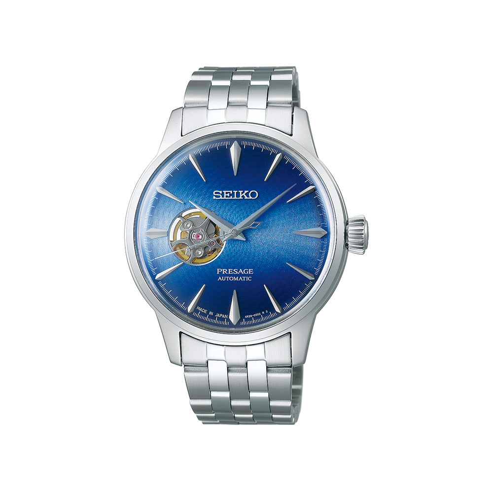 O SSA439J1 destaca-se pelo seu mostrador azul intenso com acabamento sunburst, evocando a elegância dos coquetéis clássicos. O design open-heart oferece um vislumbre do mecanismo interno, combinando tradição relojoeira com um estilo moderno e refinado.