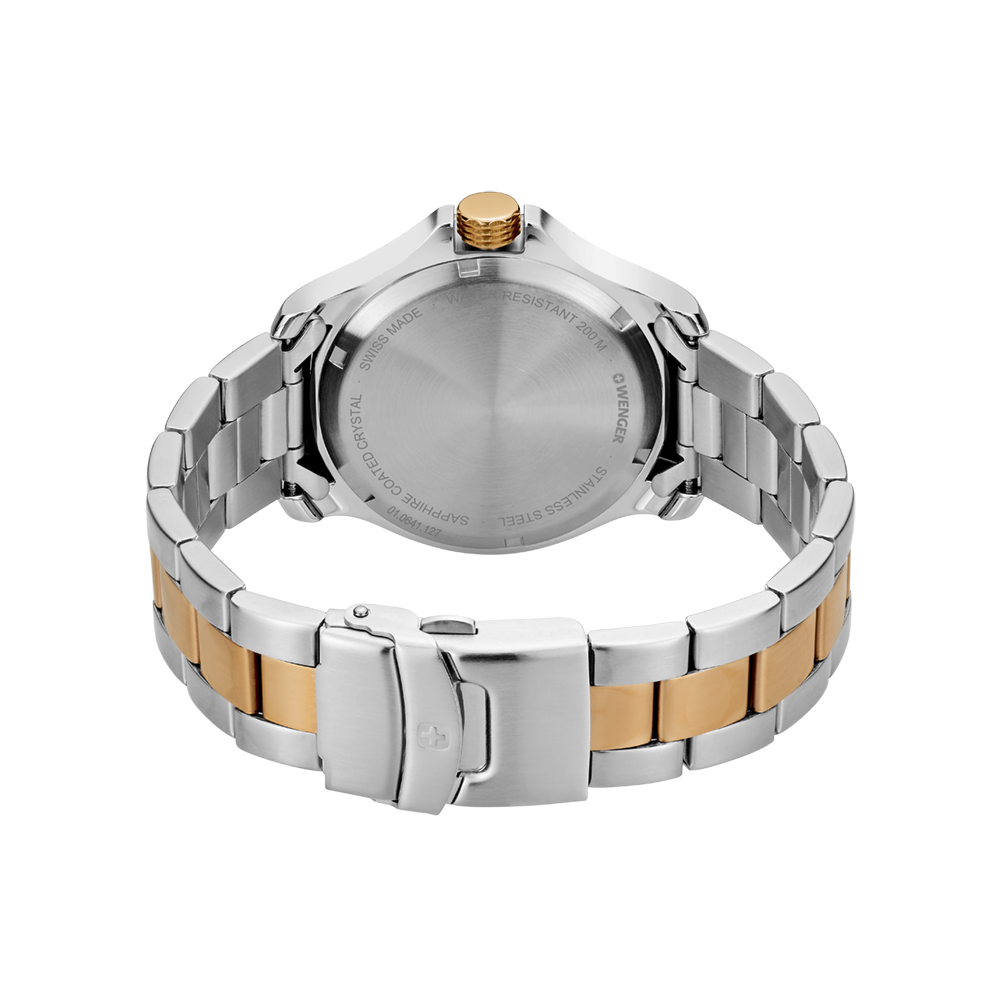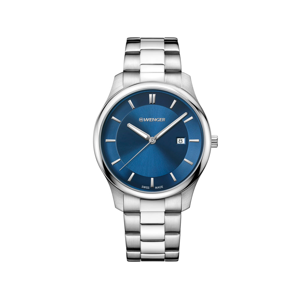 A coleção Wenger Urban Classic é um apelo emocional para pessoas ativas que se preocupam com harmonia, bem-estar e valores verdadeiros, com um toque sutil de nostalgia. Designs limpos e sóbrios combinam excelente legibilidade no escuro com ponteiros e marcadores Superluminova. A linha Urban Classic é declinada nos cronógrafos de Ø44mm e Ø43mm, assim como em Ø 42, 41 e 34mm para as versões de 3 mãos. 100m resistente à água. Todos os relógios Wenger são cobertos por uma garantia internacional de 3 anos. Características principais ° Relógio Swiss Made / Movimento Quart ° 100m / 10ATM resistente à água Detalhes Movimento: Quartzo analógico Diâmetro: 42mm Material de pulseira: aço Pulseira cor: prata e dourado Largura da alça: 22mm Resistência à água: 10 ATM / 100 M / 330 FT
