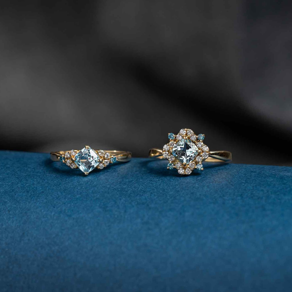 Pedras Preciosas: 1 Topázio Sky Cushion 5mm, 16 Diamantes Brancos 0,01ct, 4 Diamantes Blue 0,015ct
