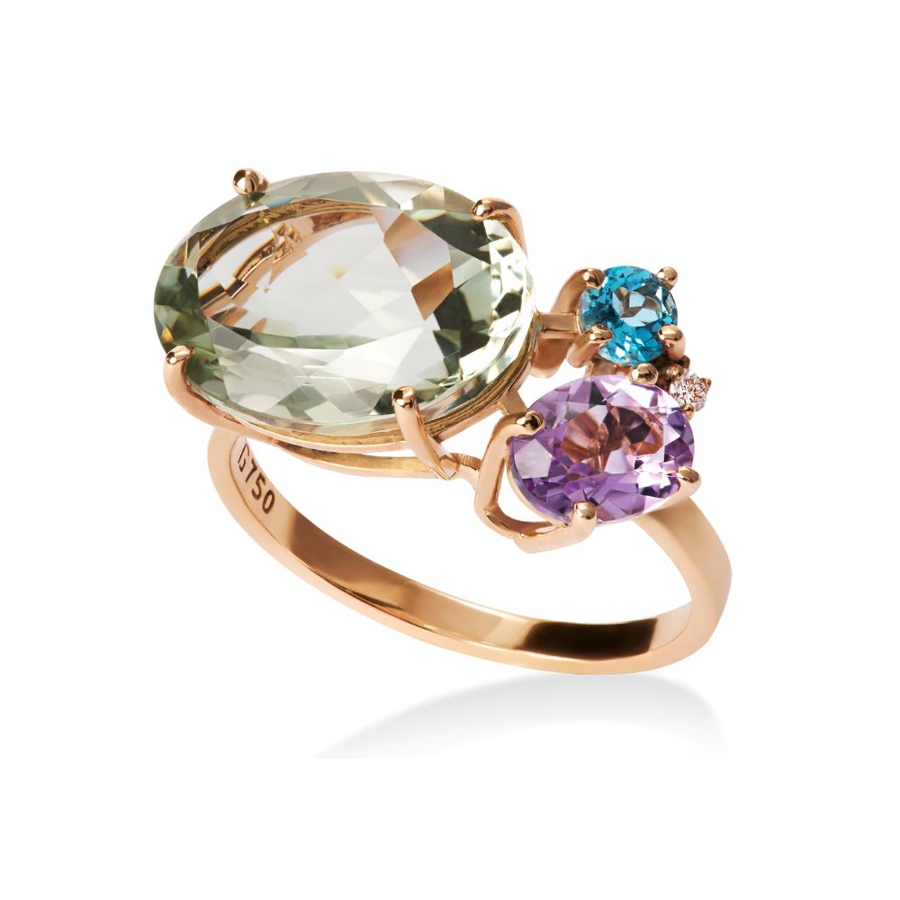 Anel Sintonia em Ouro Rosé com Ametistas, Topázios, Prasiolita e Diamante