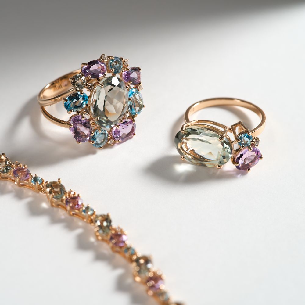 A Coleção Sintonia traduz a beleza dos encontros em cores delicadas. Este anel combina ametistas, topázio Sky e prasiolita em uma composição que parece flutuar sobre o ouro rosé, criando um jogo de luz suave e luminoso. É uma joia leve, feminina e perfeita para quem busca elegância com personalidade — um design que realça as gemas naturais e acompanha momentos especiais com sofisticação.