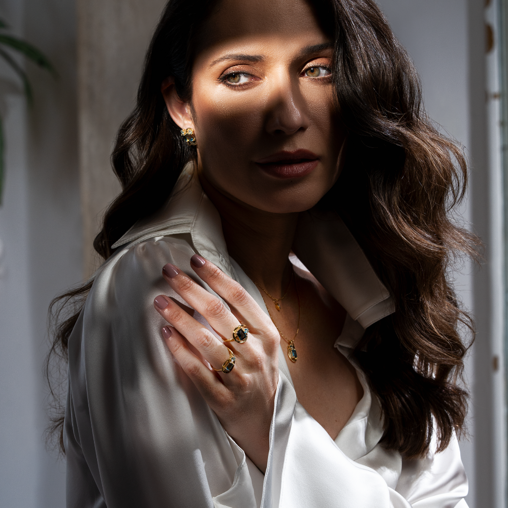 Este anel da coleção Stone une intensidade e leveza em uma mesma peça. Em ouro amarelo 18K, o contraste entre o azul profundo do topázio London e a suavidade do topázio Sky reflete a força sutil de quem valoriza joias com personalidade.