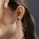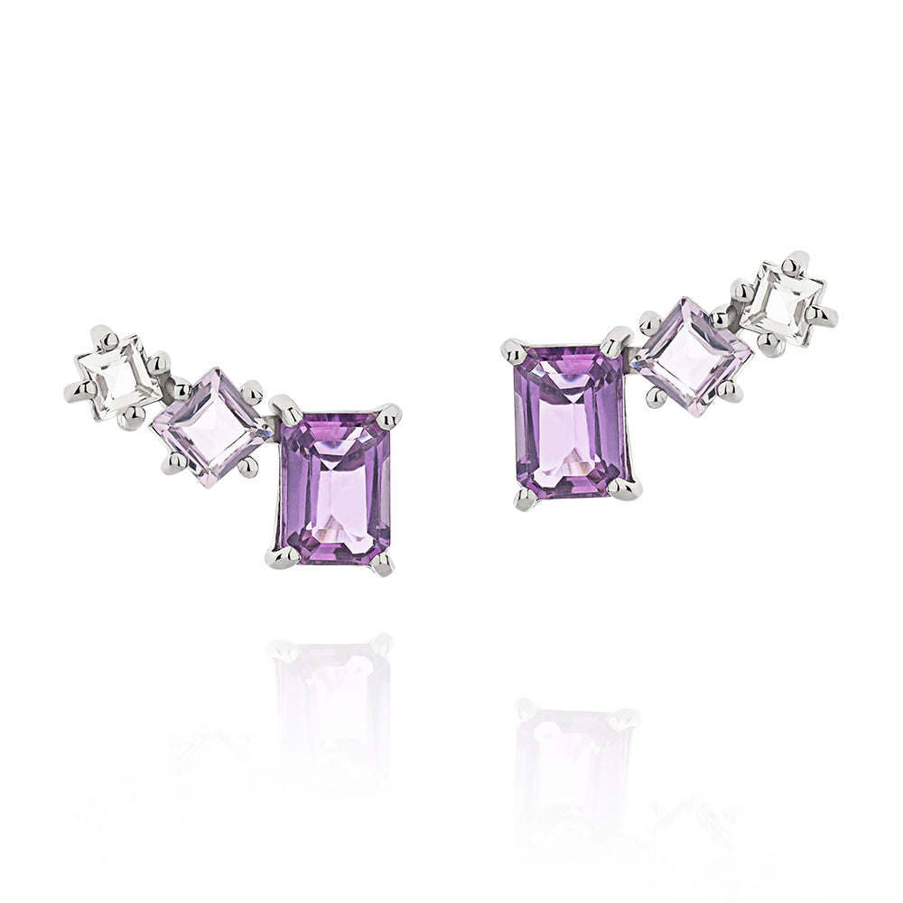 Brinco em prata 925 com banho de ródio, com ametista escura oct 7x5mm, ametista lavanda carré 4mm e topázio branco carré 3mm.