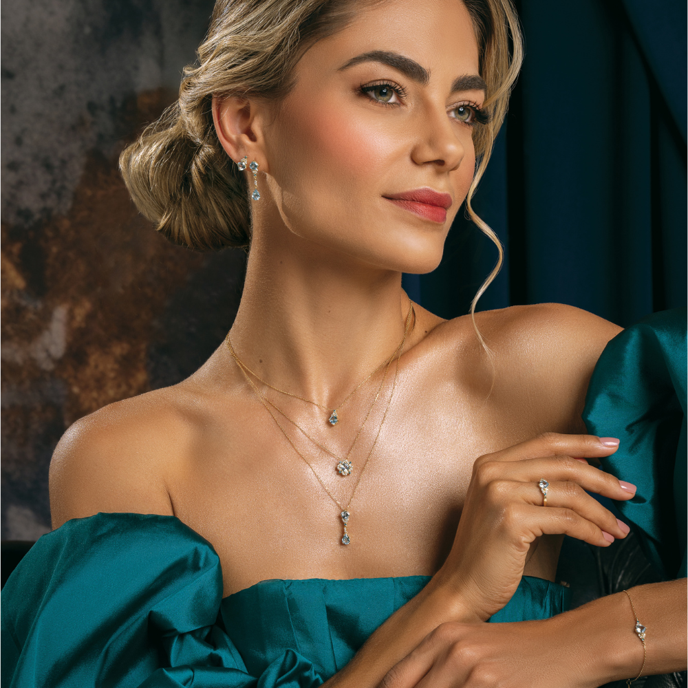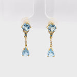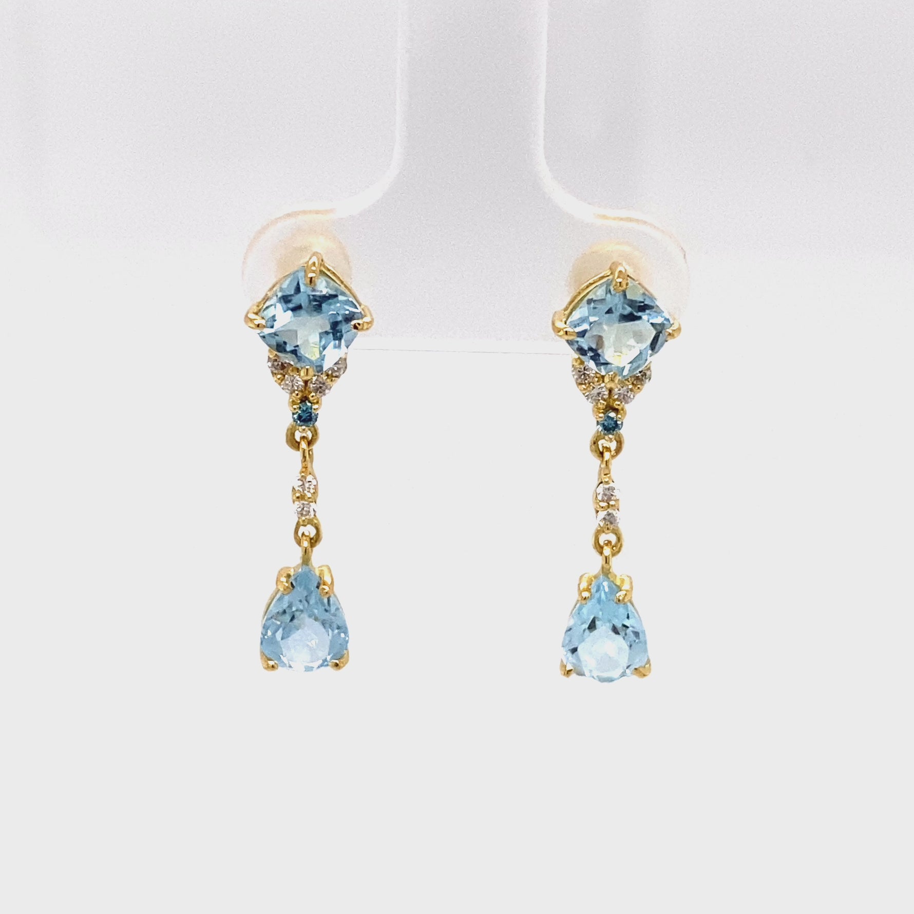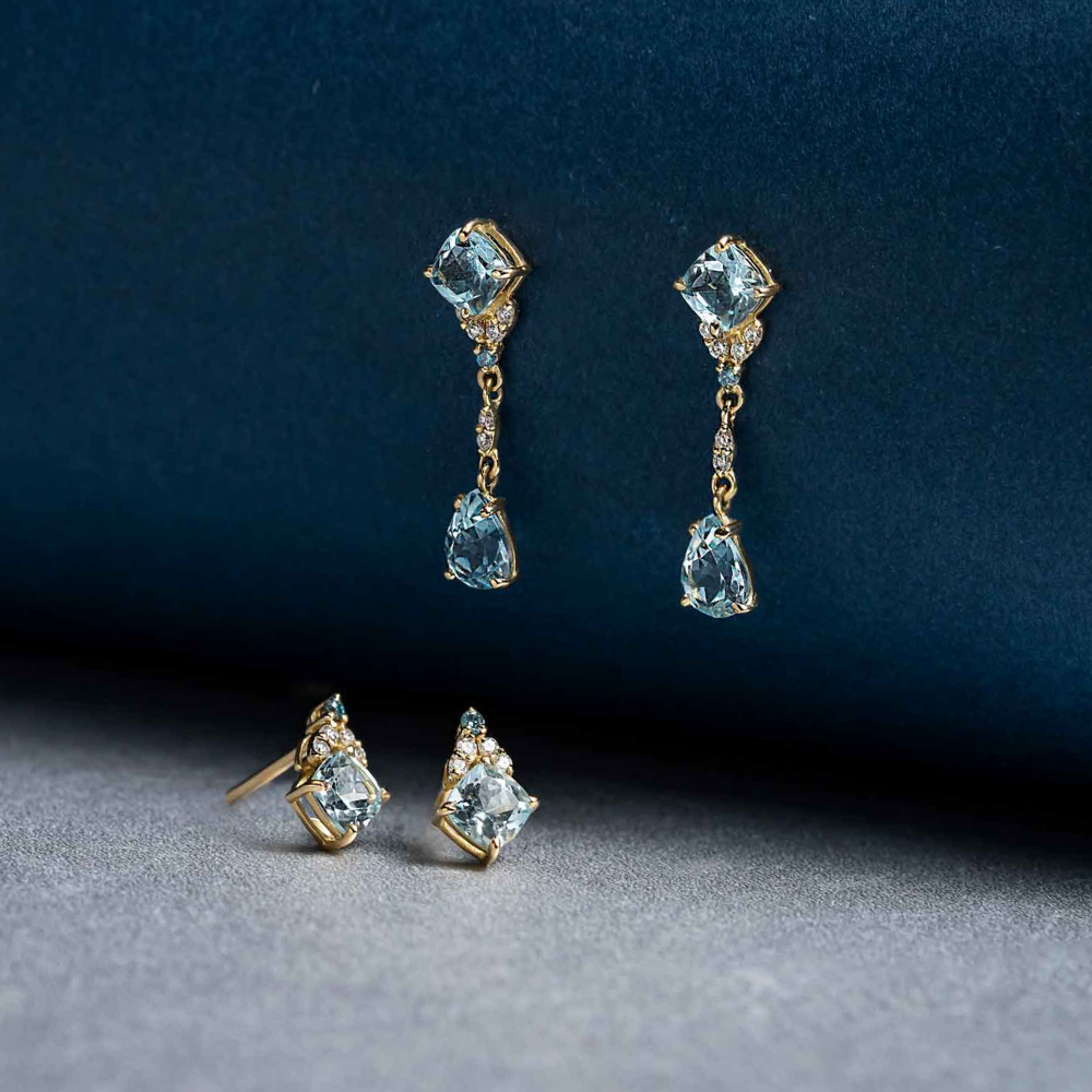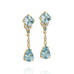 Criados meticulosamente em ouro amarelo 18k, esses brincos são uma expressão de sofisticação e beleza. Cada brinco apresenta uma combinação harmoniosa de topázios em lapidação cushion e gota, emanando a serenidade do azul sky.