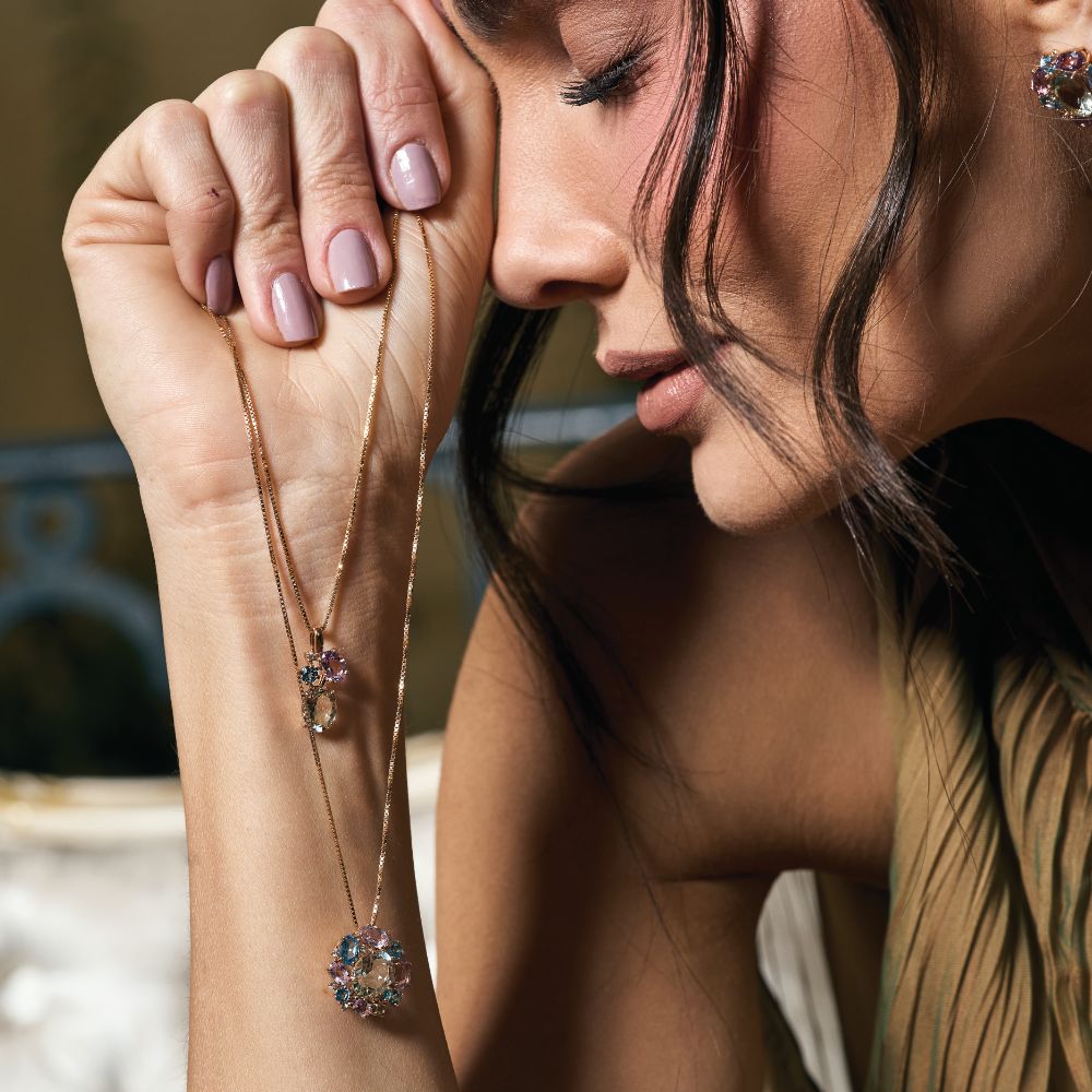 O pingente Sintonia destaca a beleza etérea da prasiolita, realçada por ametistas e topázios em tonalidades suaves. A prasiolita cria um foco de luz elegante, enquanto as gemas menores adicionam movimento e brilho sutil. É uma joia para iluminar produções especiais — delicada, feminina e com a elegância natural das gemas lapidadas com precisão.